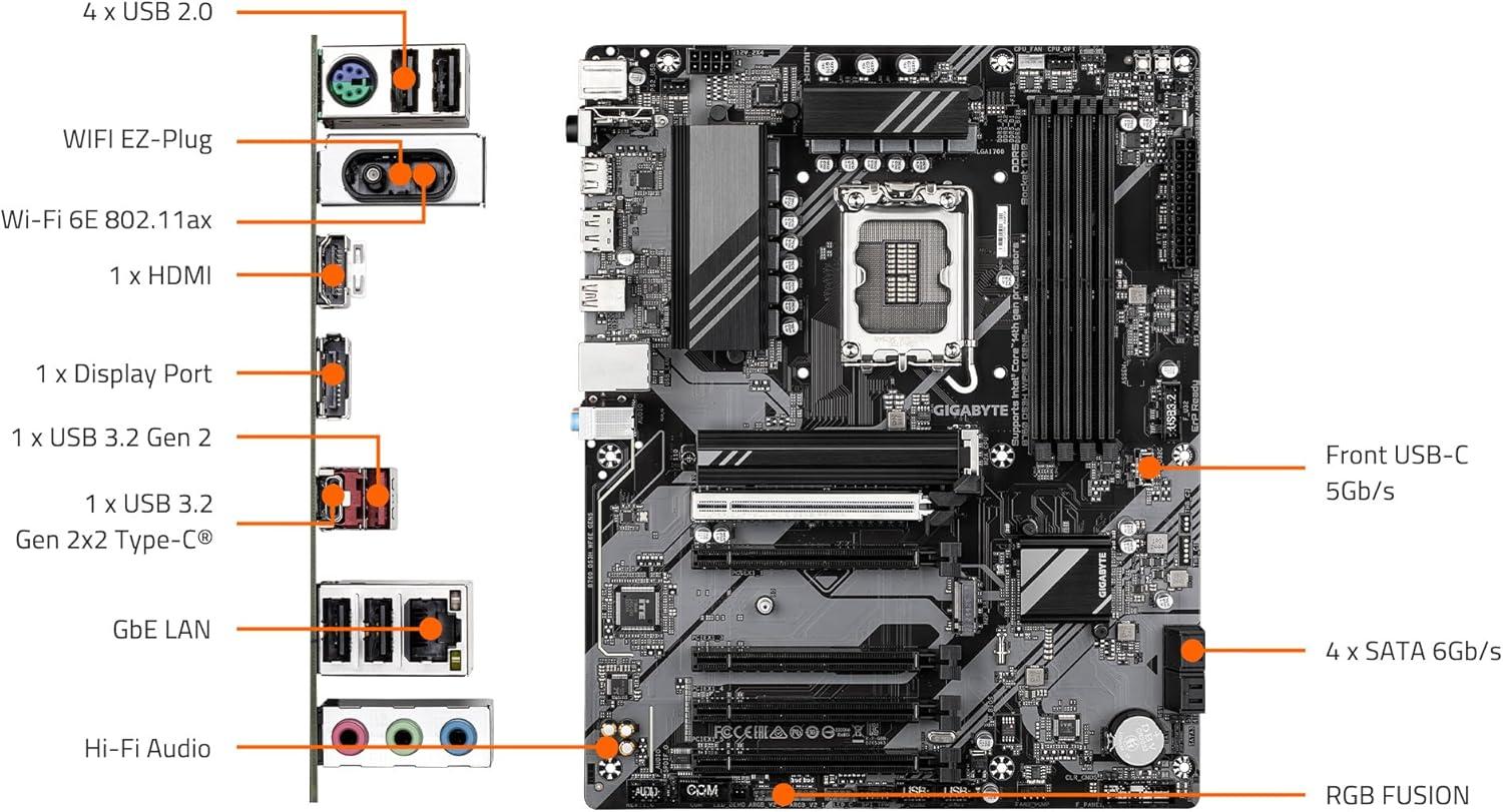 GIGABYTE B760M DS3H WIFI6E GEN5 Intel LGA 1700 mATX Motherboard, Supports Intel Core 14th/13th/12th Gen, DDR5, 6+2+1 Power Phase, 2X M.2, PCIe 5.0, USB-C, WIFI6E, 2.5GbE LAN, PCIe EZ-Latch