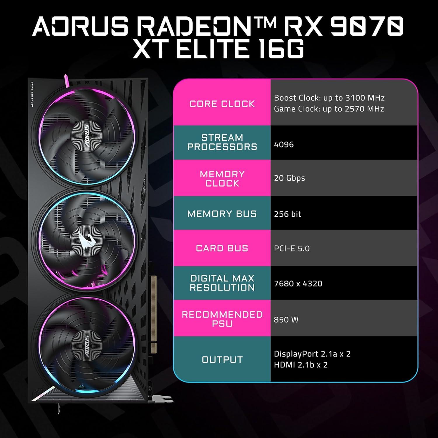 GIGABYTE AORUS Radeon RX 9070 XT Elite 16G Graphics Card, PCIe 5.0, 16GB GDDR6, GV-R9070XTAORUS E Video Card